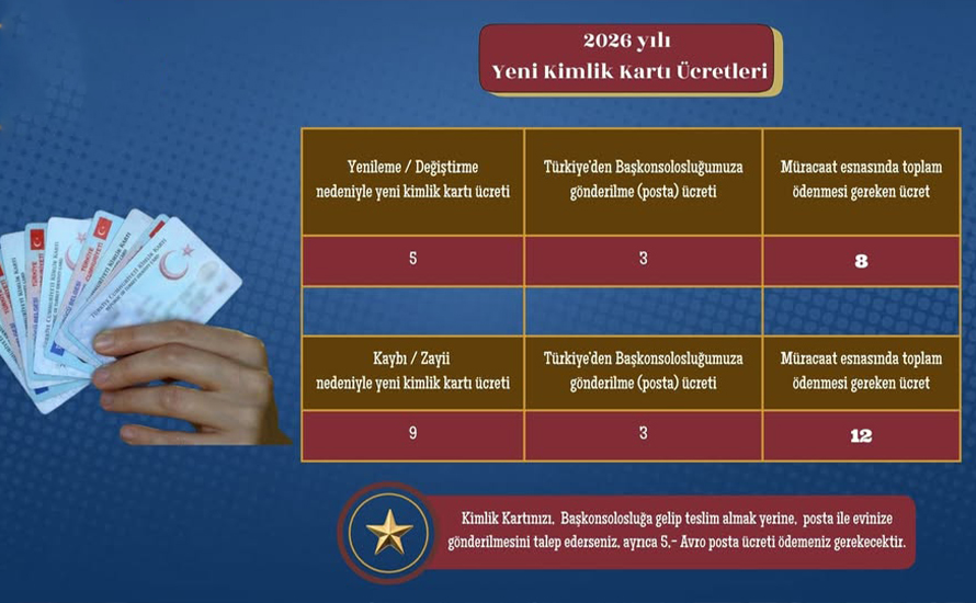 Ayrıca kimlik kartının başkonsolosluğa gelmeden posta yoluyla adrese gönderilmesi talep edilmesi hâlinde, 5 Euro posta ücretinin ayrıca ödenmesi gerekiyor.